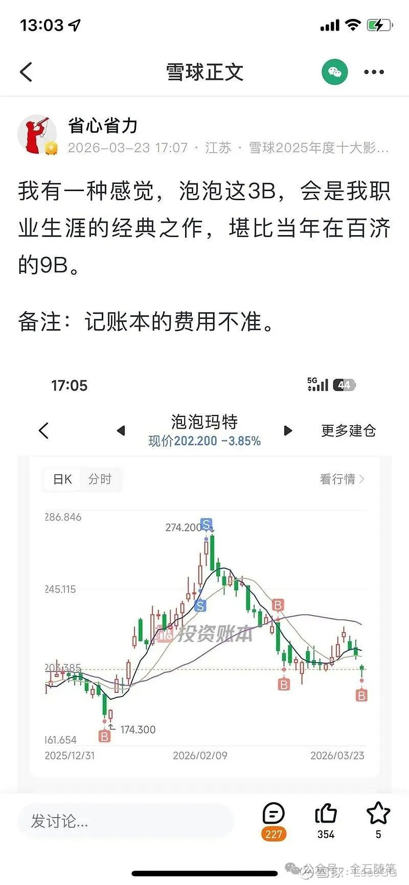 随后,他在257.2减仓1200股,269.8减仓800股,200万的持仓大约减了50万,但是又在230和200左右买了回去。就在3月23日,他还高呼:我有一种感觉,泡泡这3B,会是其职业生涯的经典之作。(也就是说,回本了没清仓,最终又套入了泡泡循环)