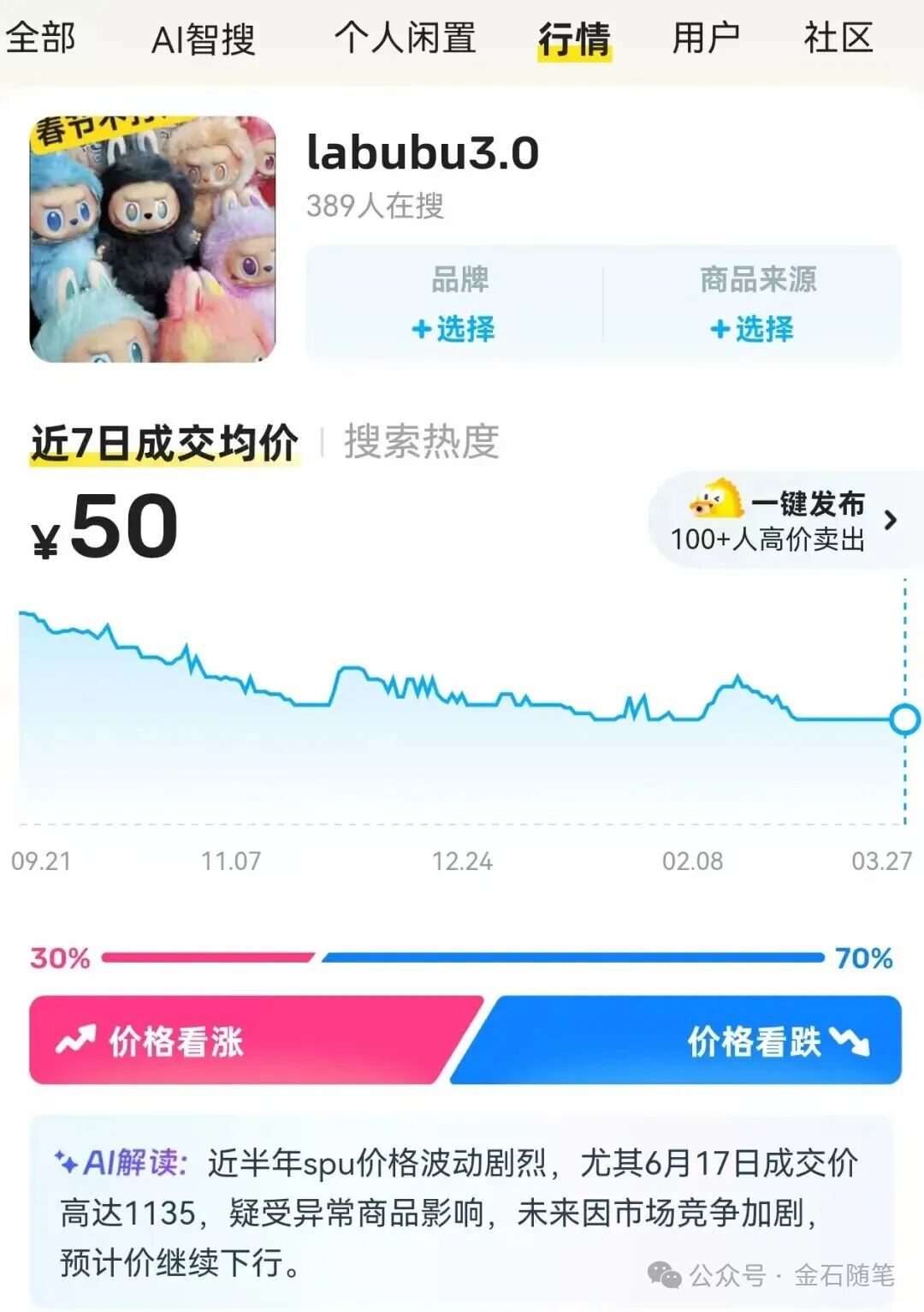 关于泡泡玛特持续阴跌,简单谈下原因:二手市场价格持续下跌,比如拉布布3.0,6月成交价高达1135元,如今成交价只有50元,可以说惨不忍睹,且依然有70%的人认为价格还会下跌。