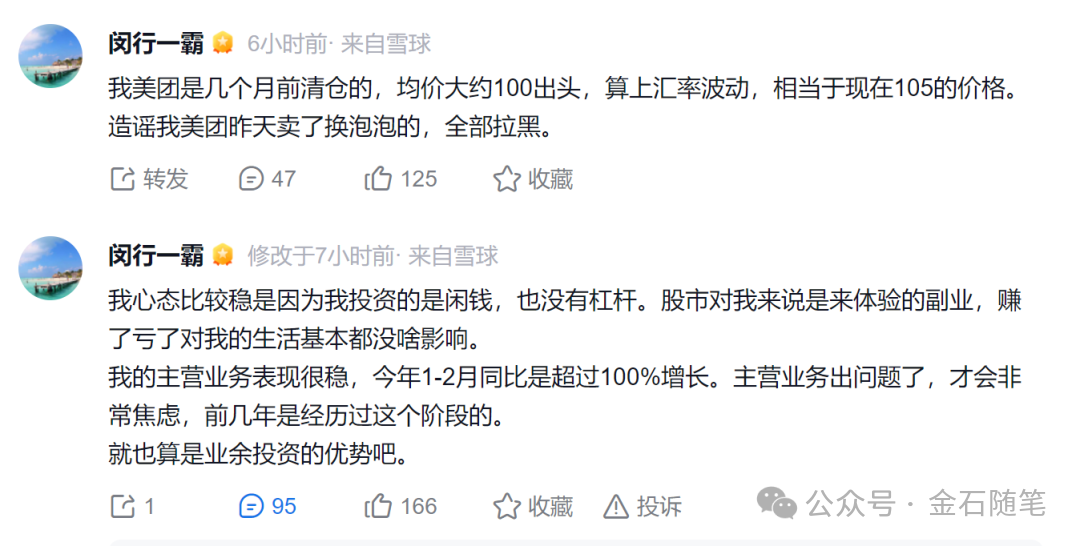 不过,关于他今天有个谣言,说他昨天卖出美团买入泡泡,其实美团几个月前就清仓了。而泡泡则是3月14日已经子弹打满。