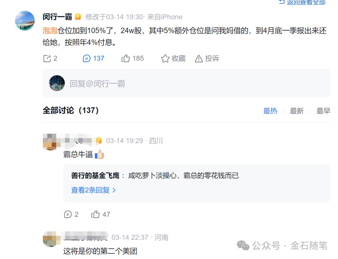 其实,省大可能只是开胃菜,金石杂谈还发现,另一位雪球大V则更显悲怆。据其爆料,个人泡泡仓位105%,24万股,5%仓位还是从老妈那借的。也就是说今日大跌前,这24万股价值大约5000万,妈妈那资金额有250万。如果消息为真,经此一役,闵行单日亏了1000万,给妈妈亏了50万。