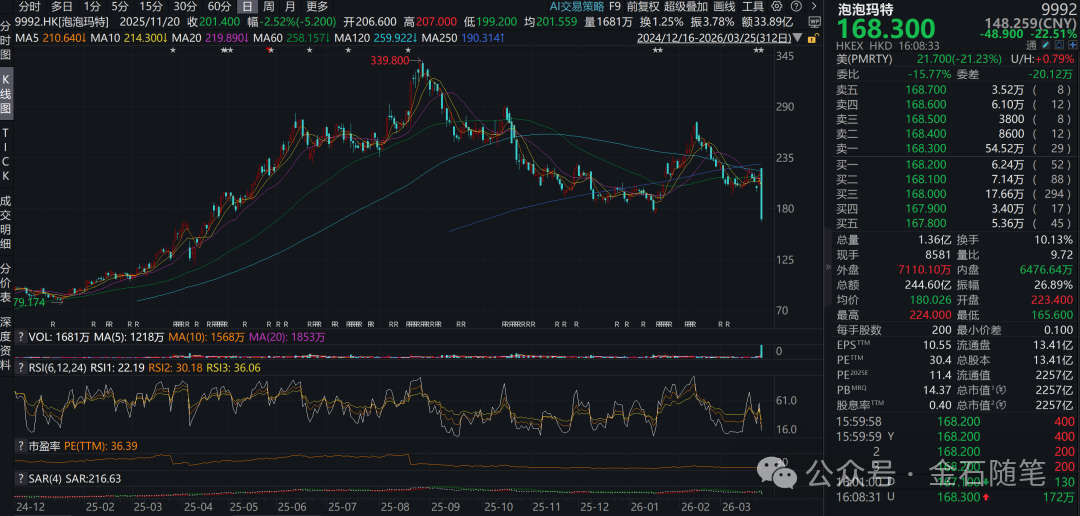 3月25日消息,10倍大牛股泡泡玛特突然崩了,公司在中午发布业绩后,午后直线跳水,最终狂跌22.51%,单日市值蒸发656亿港元,最新市值2257亿港元。